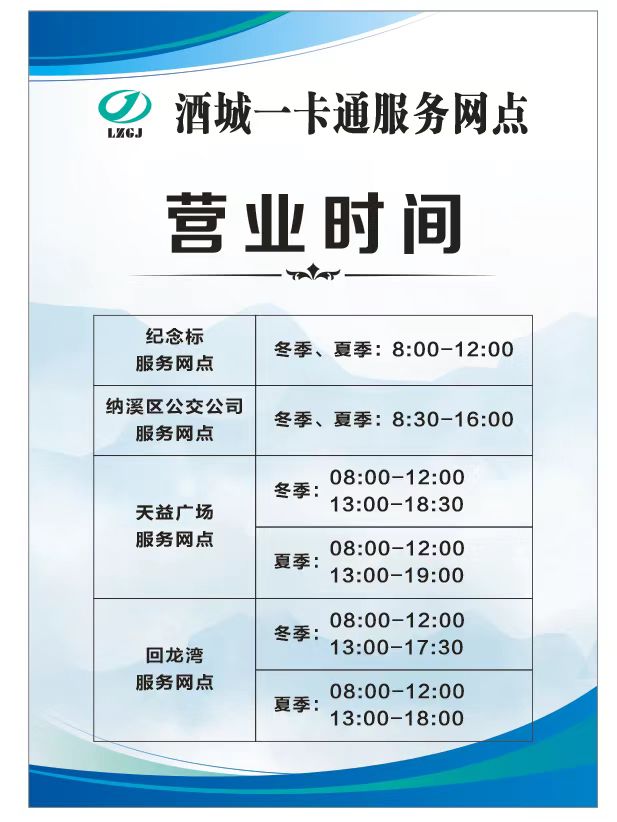 4.掛失、補卡:本人持身份證或戶口簿和1張2寸免冠彩照到本地任何公交酒城一卡通服務(wù)網(wǎng)點辦理。同時繳納補卡工本費5元,原卡剩余次數(shù)及金額自動轉(zhuǎn)入新卡。