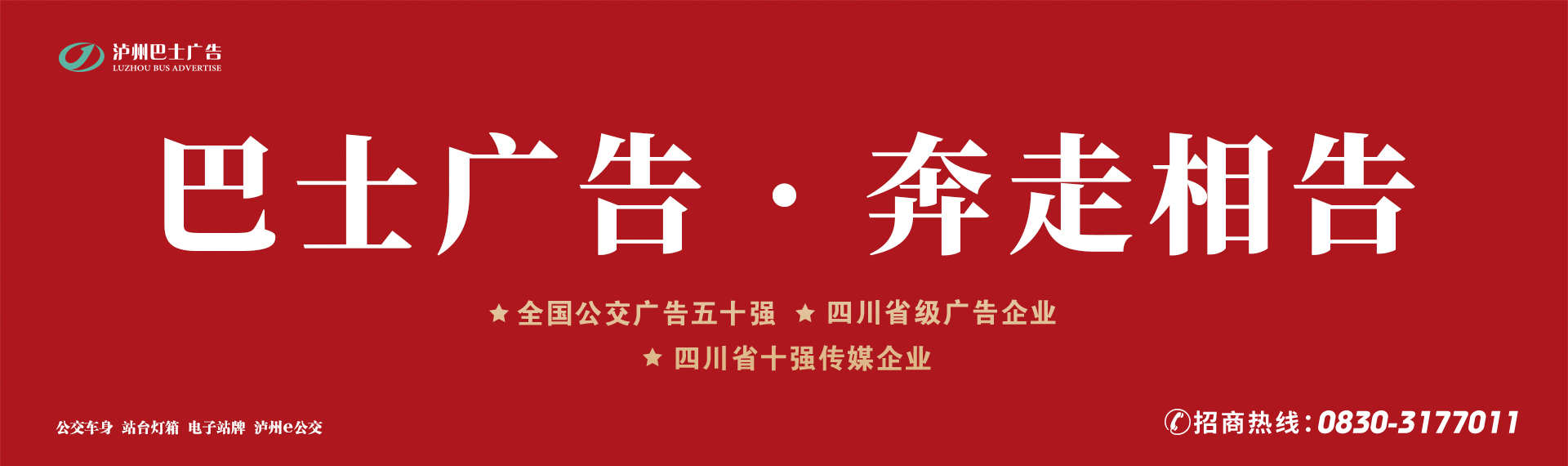 瀘州公交巴士廣告公司創(chuàng)建于1992年3月,是瀘州城市公交廣告媒體唯一經(jīng)營(yíng)單位,媒體傳播及綜合影響力在同行業(yè)中穩(wěn)居前列。一直以來(lái),秉承著“依法治企、制度管理、誠(chéng)信為本、創(chuàng)新超越”的治企理念,立足城市公交服務(wù),開(kāi)展實(shí)施“文化+公交”服務(wù)模式,圍繞“一線一特色”,為企業(yè)傳播價(jià)值,為社會(huì)傳遞正能量。