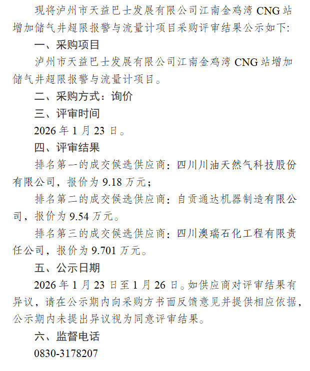 瀘州市天益巴士發(fā)展有限公司江南金雞灣CNG站增加儲氣井超限報警與流量計項目采購評審結(jié)果公示